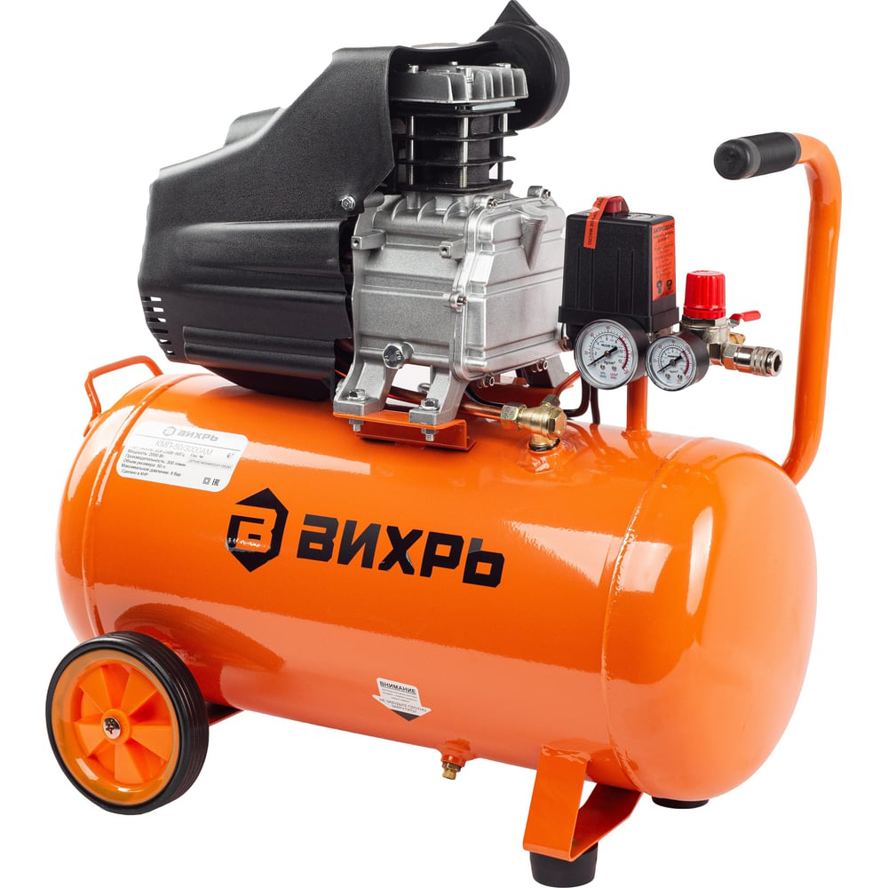 Компрессор Вихрь КМП-50/300АМ предназначен для нагнетания сжатого воздуха в пневматическое оборудование. Он активно используется на строительных площадках, в ремонтных мастерских, на производстве, на шиномонтаже.Основная конструктивная часть компрессора – ресивер. Он позволяет накапливать сжатый воздух, охлаждать его, собирать образовавшийся конденсат. Компрессор имеет прессостат, позволяющий ему функционировать в рамках необходимого давления в автоматическом режиме. Воздушный фильтр предохраняет поршневую группу от попадания пыли и мусора.Отличительные особенности модели Вихрь КМП-50/300АМ:Номинальная мощность устройства составляет 2 кВт.Производительность – 300 л/мин. При подборе компрессора очень важно обращать внимание на эту характеристику. Производительность компрессора должна быть в 1,5 раза больше необходимой. Так устройство будет работать в экономичном режиме и прослужит дольше.Объем ресивера составляет 50л. Это позволяет получить стабильную подачу сжатого воздуха.Низкий уровень шума – 75 дБ.Термозащита отключает оборудование при перегреве и возобновляет его работу после охлаждения.На ножках расположена антивибрационная насадка.Транспортировочные колеса позволяют с легкостью перемещать устройство.Компрессор Вихрь КМП-50/300АМ способен обеспечить работу большого количества пневматического оборудования за счет хороших параметров. Без него не обойтись на шиномонтаже, на строительной площадке.