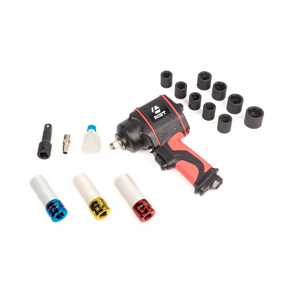 Компактный и легкий профессиональный пневмогайковерт ударный на 1/2 дюйма имеет композитный корпус, 3-ри положения регулировки мощности на закручивание и 3-ри скорости на откручивание (реверс). Ударный пневмогайковерт идеально подходит для оснащения шиномонтажа или автосервиса, а также для гаража. Укороченный компактный корпус позволяет использовать ударный пневматический гайковерт в стесненных условиях. Реальное развиваемое усилие пневматического гайковерта на 76 кг-м/746 Нм проверялось на специальном динамометрическом стенде. Ударный механизм TWIN HAMMER, обеспечивает плавный и сбалансированный "удар", низкий уровень вибрации и высокий крутящий момент на старте работы. Использовать пневматический гайковерт необходимо только с ударными торцевыми головками. Также для долговечности работы пневмогайковерта необходимо смазывать инструмент, используя лубрикатор или капать масло во внутрь гайковерта через отверстие внизу рукоятки. Удобный переключатель реверса находится на передней стороне пневмогайковерта. Имеет эргономичную рукоятку.