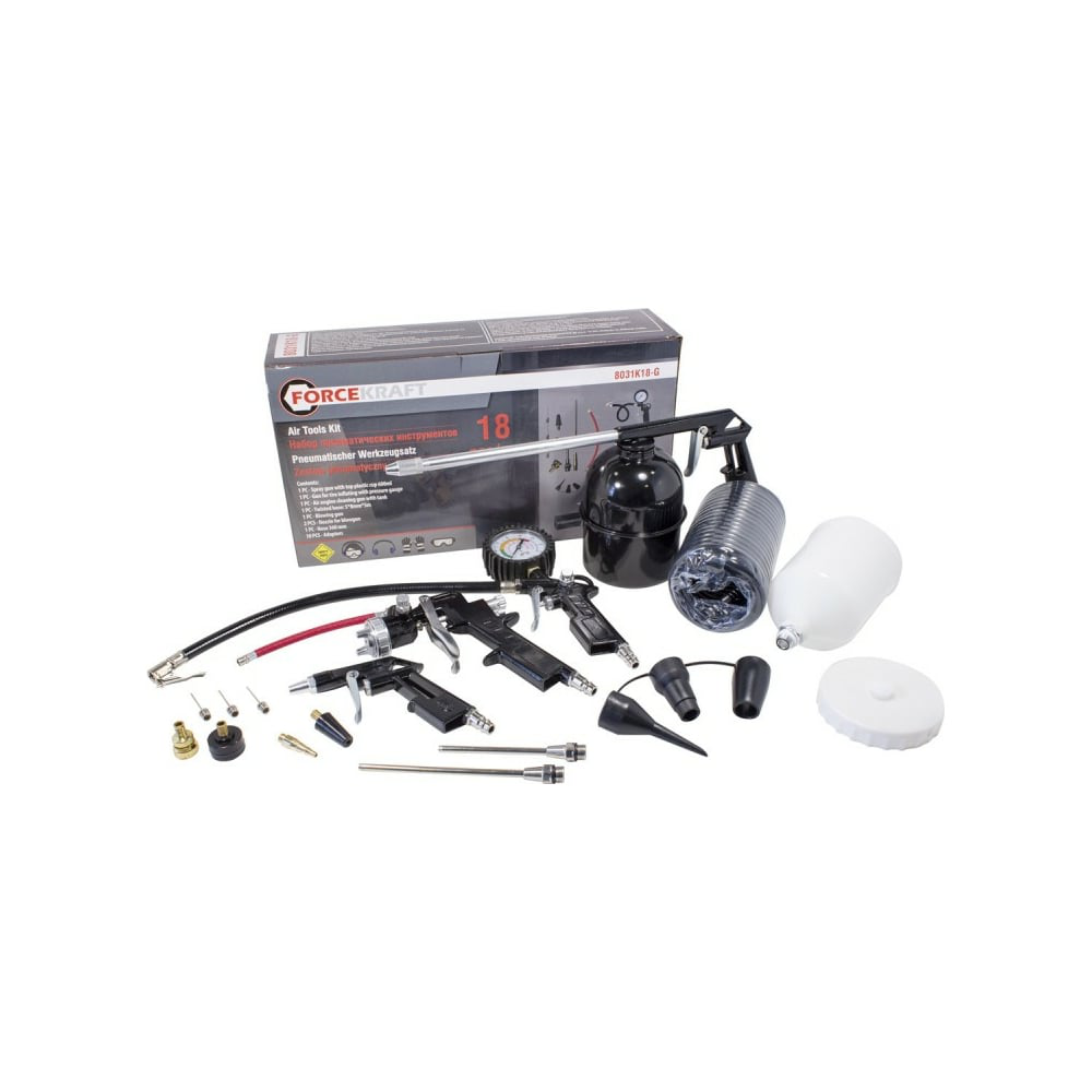 Набор пневмоинструментов FORCEKRAFT (18 предметов) — универсальный комплект, объединяющий всё необходимое для выполнения широкого спектра задач: от покрасочных и очистительных работ до мойки двигателя и подкачки шин. Идеален как для профессионального применения в СТО и мастерских, так и для продвинутых автолюбителей.Преимущества:Прочная металлическая конструкция — повышенная износостойкость и долгий срок службы;Функциональность — один набор покрывает ключевые задачи по обслуживанию и ремонту;Эргономичность — продуманная форма инструментов для удобства и безопасности оператора;Полноценная комплектация — всё необходимое под рукой без необходимости докупать аксессуары;Подходит для любых условий — от гаража до промышленного использования.