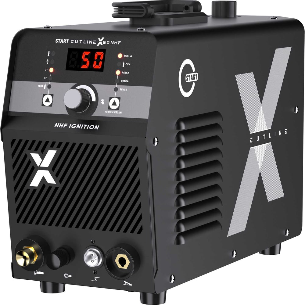 START CutLine X50 NHF - Легкий и компактный источник с пневмоподжигом - подходит для воздушно плазменной резки углеродистой стали, нержавеющей стали, алюминиевых сплавов, меди и других цветных металлов. Источник универсальный – может быть использован как для ручной резки так и в паре с ЧПУ столом.CutLine X50 NHF имеет бесконтактный поджиг и работает от бытовой сети напряжением 220 вольт, что обеспечивает его широкое применение в различных условиях, включая домашние мастерские, гаражи и небольшие производственные помещения.В данном аппарате дополнительно реализована возможность резки сетки, перфорированной поверхности и маркировки металла благодаря наличию дежурной дуги. Режим резка – высококачественная резка стали, толщиной от 1-25 мм;Режим сетка – позволяет эффективно и быстро выполнить резку металлической сетки, дежурная дуга в данном режиме не дает гаснуть плазмообразующему потоку;Режим текст – позволяет наносить маркировочные надписи на металлической поверхности.На задней панели источника установлен фильтр-регулятор, который входит в комплект поставки. Фильтр предназначен для подготовки сжатого воздуха, обеспечивая его очистку и осушение.Особенность плазматрона с пневмоподжигомПоступающий в резак поток сжатого воздуха разделяется на 2 части : плазмообразующий поток – он же режущий;охлаждающий, он же поддерживает расстояние между подпружиненным катодом и соплом. Благодаря охлаждению расходных частей увеличивается их срок службы