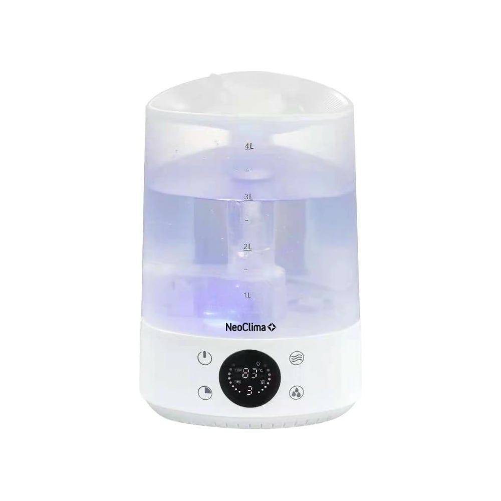 Дополнительные характеристики ультразвукового увлажнителя воздуха NeoClima объем 4 л, NHL-400E 48720: Цифровой дисплей. 3 режима работы. Индикация уровня влажности. Индикация температуры воздуха. Встроенный гигрометр. LED подсветка. Три скорости работы. Прибор автоматически отключится при опустошении бака.