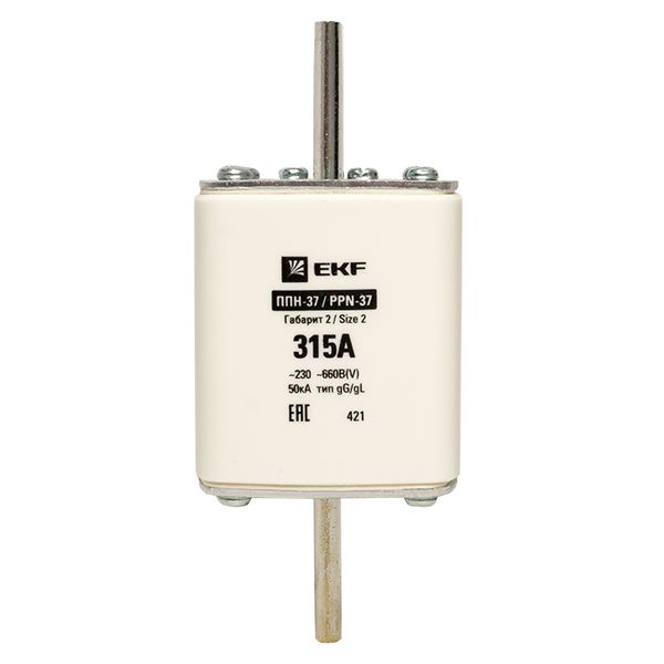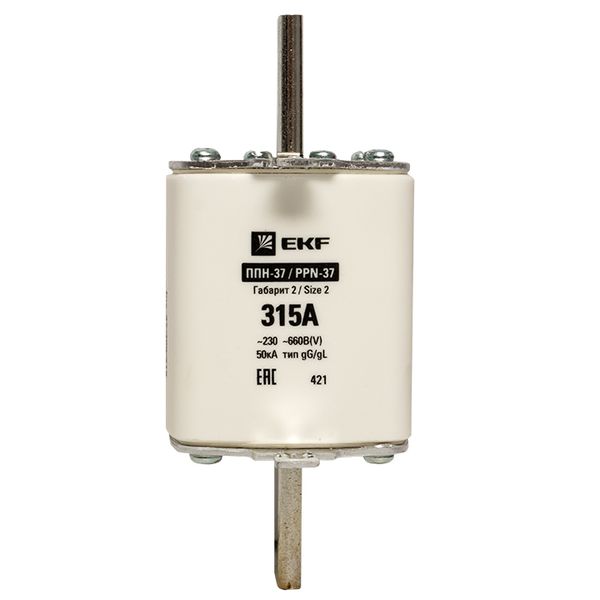 Плавкая вставка ППН-37 400/315А габарит 2 EKF. Предохранители плавкие ППН EKF, укомплектованные плавкими вставками типа gG/gL, предназначаются для защиты кабельных линий и промышленных электроустановок от токов перегрузки и короткого замыкания. Предохранители применяются в электрических сетях переменного тока частотой 50 Гц с напряжением до 660В. Применяются для крепления в распределительных и вводно-распределительных устройствах. Предохранители плавкие ППН могут устанавливаться в основание с держателем, а также в специально предназначенные рубильники. В комплект поставки предохранителей плавких ППН основание с держателем не входит и приобретается отдельно.