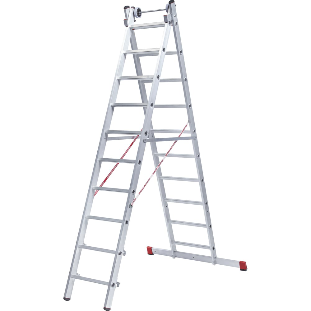 Алюминиевая двухсекционная индустриальная лестница Новая Высота 2х18 5220218 может использоваться в качестве приставной лестницы, приставной выдвижной лестницы и стремянки. Имеет надежную и прочную алюминиевую конструкцию, которая способна выдержать нагрузку до 150 кг. Верхняя секция оборудована колёсами для удобства раздвижения по стене. Все зацепы имеют автоматический фиксатор, что облегчает эксплуатацию лестницы. На траверсе и стойках расположены опорные наконечники из пластика, которые препятствуют скольжению. Ступени с рифлёной поверхностью обеспечивают безопасный подъем и спуск. Внимание! Количество ступеней отличается от представленного на фото.