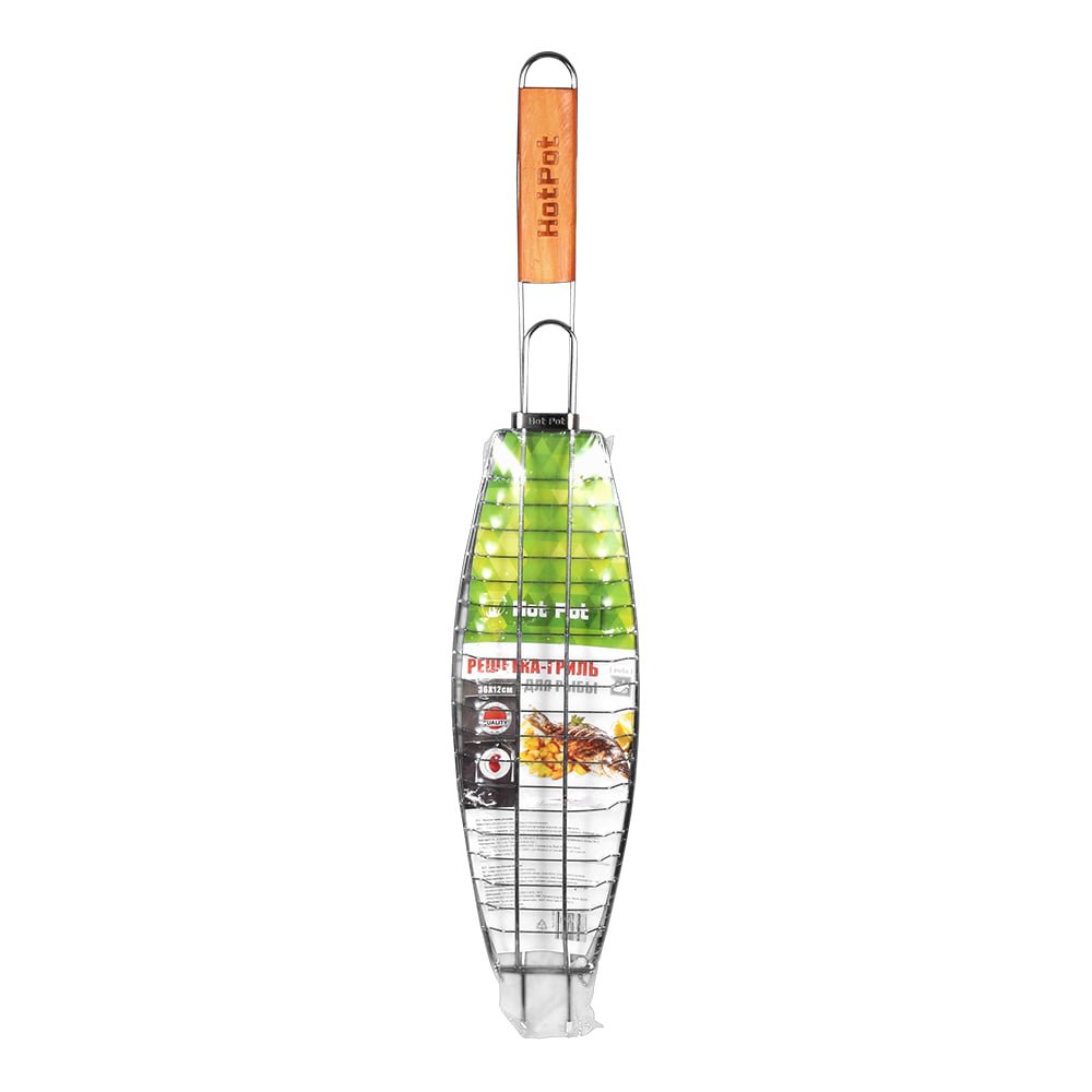 Решетка-гриль для рыбы Hot Pot 60(+4)х36х12х4 см 61340 используется для приготовления пищи на мангале. Хромированное покрытие сделает процедуру чистки легкой и быстрой. Модель имеет деревянную ручку, которая не нагревается при использовании.