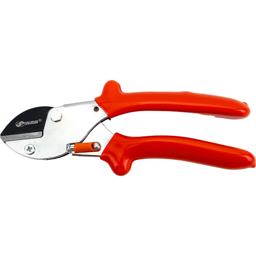 Секатор-сучкорез SKRAB садовый 168 мм 28342 выполнен из высокоуглеродистой стали SK5. Лезвия секатора покрыты тефлоном, что уменьшает трение, предотвращает налипание грязи и предотвращает от коррозии. Стальные рукоятки имеют противоскользящее обрезиненное покрытие. Секатор-сучкорез обеспечивает ровный и чистый рез живых веток диаметром до 15мм. Подойдет для подрезке жестких, сухих кустарников и живых веток.